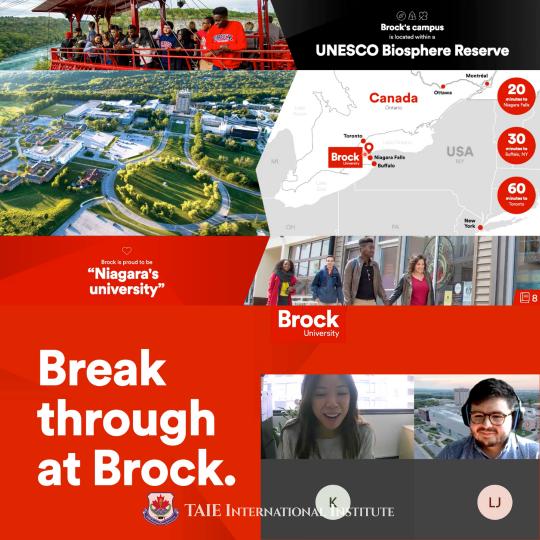 October 4 Today, Brock University hosted a webinar to present to TAIE students online and answer questions about programs, how to apply and offers of admission. Santiago’s presentation was super informative. There were some great questions asked by TAIE students too. Brock University is a great school and we are glad we had the opportunity to learn more about it today. Thanks again to Santiago (International Recruitment Officer at Brock University) for giving us such a great presentation!